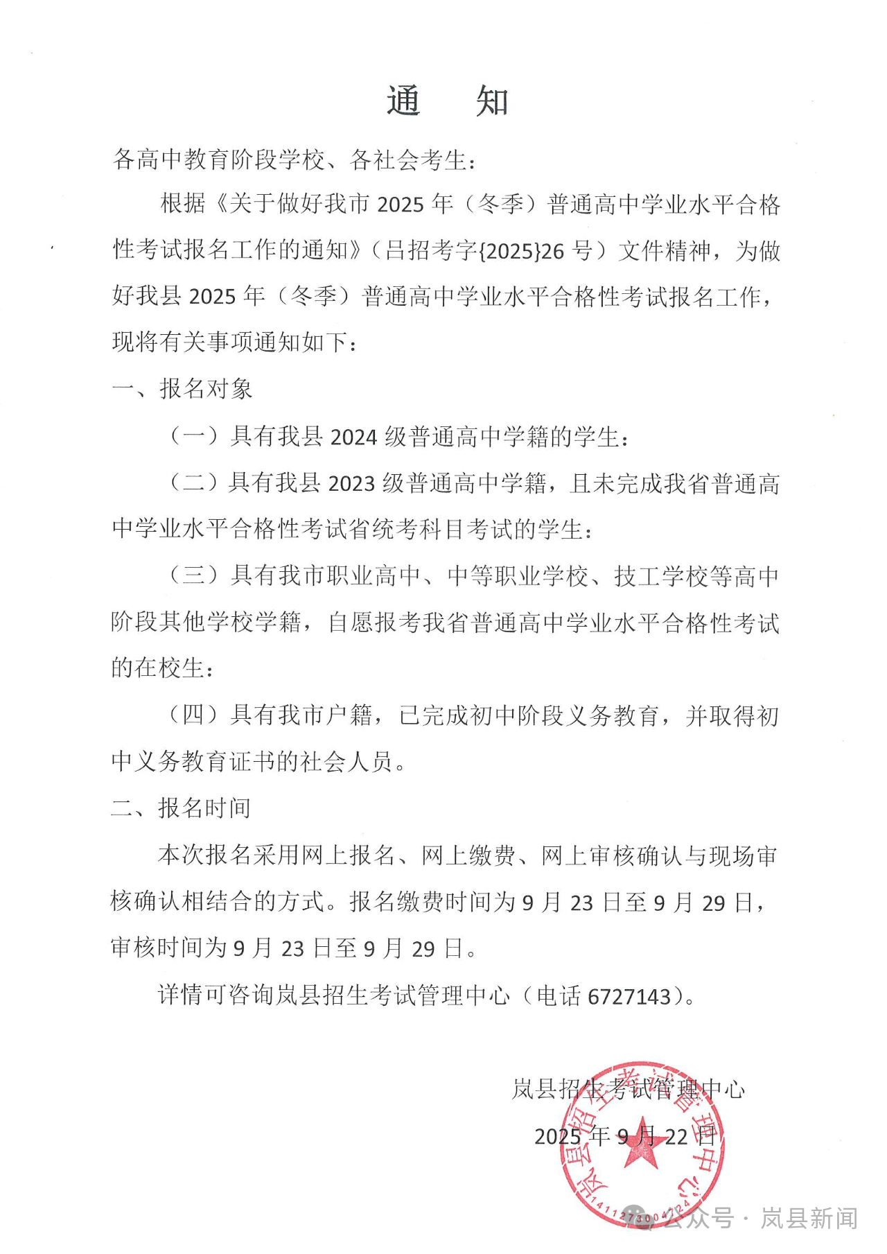 【通知】我縣2025年(冬季)普通高中學業水平合格性考試報名工作通知